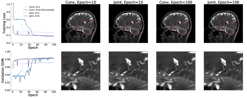 Figure 10 presents the training curves, validation SSIM, and sample reconstructions for all versions of the MoDL architecture. All networks attain similar validation SSIM values, but MoDL networks with joint layers achieve high reconstruction quality in roughly a third as many epochs as image space networks. Further, using our joint layers removes the need to pretrain a one-iteration network. The five-iteration network with joint layers trains successfully from random initializations. The resulting differences in wall clock training times are summarized in Table 1.