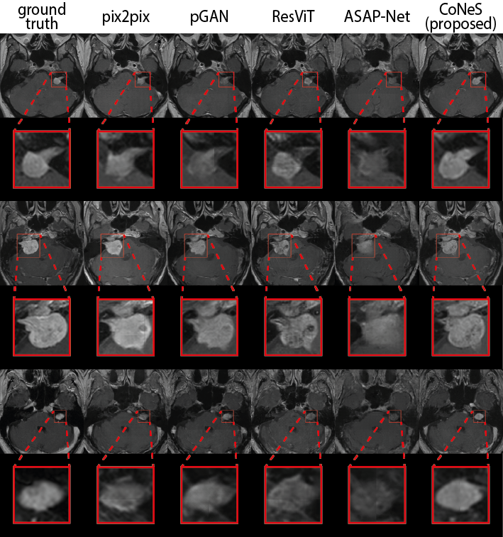 We also performed the same segmentation experiments on the VS dataset. We evaluated the performance using three specific categories: 1) intrameatal tumor; 2) extrameatal tumor); and 3) the whole tumor (including intra- and extrameatal tumor). Dice score and 95% HD of all three categories are reported in Table 6. Similarly to BraTS 2018, all the synthesized images compensate for the performance loss due to the drop of sequences, and the proposed model performs significantly better () than the other models. For instance, the synthesized T1ce generated by the proposed model obtained Dice scores of 0.567, 0.714, and 0.749 in the intrameatal tumor, the extrameatal tumor, and the whole tumor respectively. In comparison, the proposed model outperforms zero imputation by 56.6%, 68.4%, and 72.1%, pix2pix by 9.6%, 2.8%, and 3.6%, pGAN by 12.6%, 3.8%, and 8.8%, ResViT by 2.7%, 0.1%, and 3.0%, and ASAP-Net by 25.9%, 22.2%, and 24.1%. The 95% HDs of the proposed model are 2.33 mm, 3.54 mm, and 4.05 mm in the intrameatal tumor, the extrameatal tumor, and the whole tumor respectively. These results outperform zero imputation by 5.71 mm, 25.37 mm, and 30.05, pix2pix by 0.21 mm, 2.13 mm, and 2.45 mm, pGAN by 0.15 mm, 3.03 mm, and 3.82 mm, ASAP-Net by 0.77 mm, 3.72 mm, and 8.35 mm. We observed that ResViT obtained lower 95% HD (3.32 mm) in the extrameatal tumor, however, the proposed model still performs better than ResViT in most of the experiments. Example segmentation results are displayed in Fig. 5.