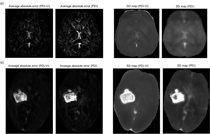 For the COSMOS test dataset, we compared PDI (Eq. 8), PDI-VI0 (Eq. 10 without PDI pre-training) and PDI-VI (Eq. 10 with PDI pre-training) to MAP estimation MEDI (Liu et al., 2012) and two deep learning reconstructions QSMnet (Yoon et al., 2018) and FINE (Zhang et al., 2020a). Reconstruction maps of one orientation from one test subject are shown in Figure 2. Quantitative metrics of each reconstruction method averaged among 10 test brains are shown in Table 1. FINE gave the best overall quantitative results with the expense of significantly increased computational time. The other methods had comparable results. All deep learning methods achieved fast inference time on GPU except FINE. In Figure 2, error maps of PDI, PDI-VI0 and PDI-VI’s mean outputs matched their SD outputs , with high uncertainty/error located at the sagittal sinus and globus pallidus. The SD output of PDI-VI0 and PDI-VI were sharper than PDI with lower white-grey matter variation.