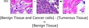 We also found that linear interpolations between two latent vectors have better feature transformations when the mapping network and style mixing regularization are introduced. Figure 7 shows linear interpolations in latent space between images with malignant tissue and benign tissue. (a, c) correspond to a model with a mapping network and style mixing regularization and (b, d) to a model without those features, we can see that transitions on (a, c) include an increasing population of cancer cells rather than the fading effect observed in images of (b, d). This result indicates that (a, c) better translates interpolations in the latent space, as real cells do not fade away.
