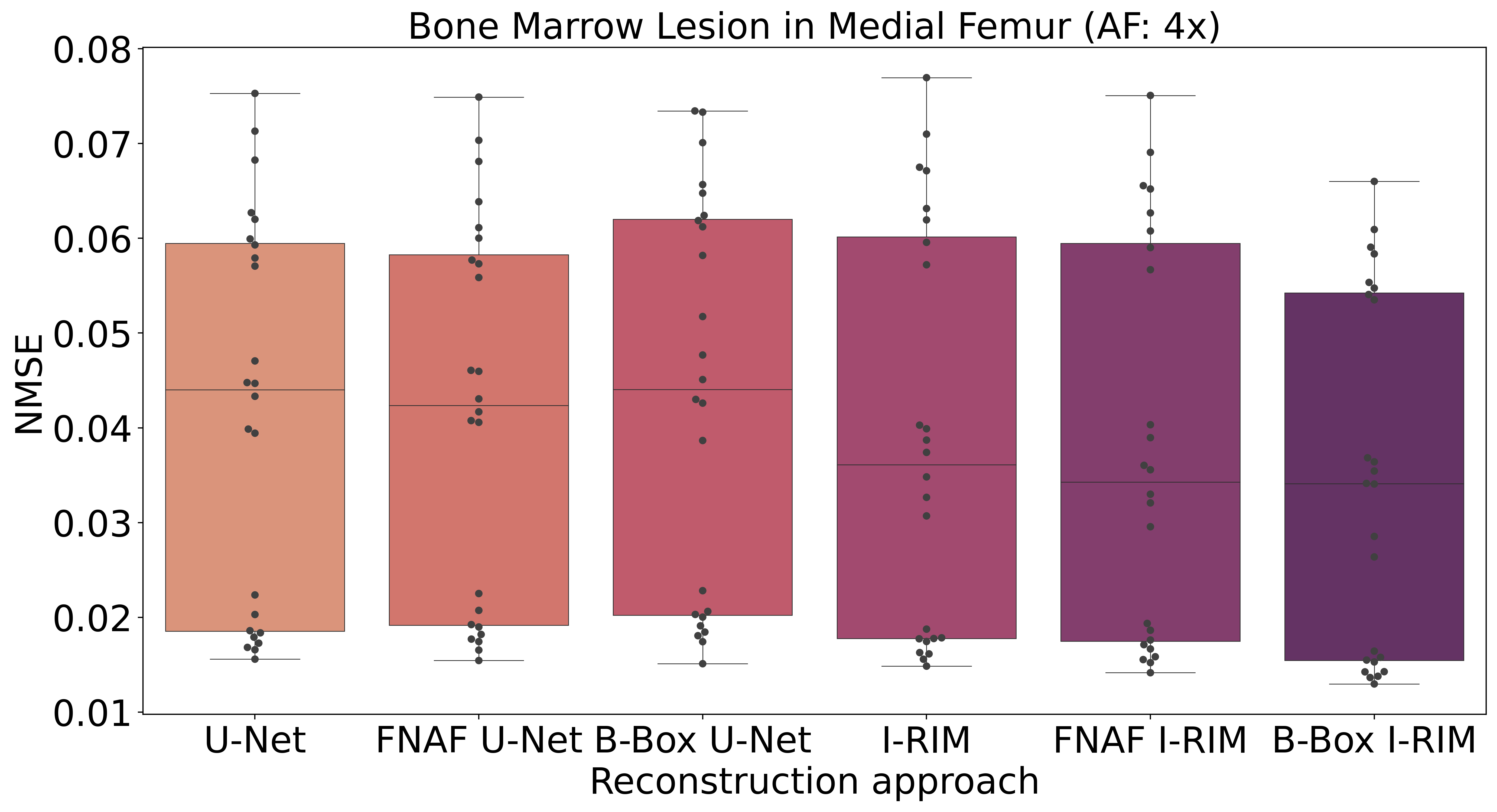 The quality of abnormality reconstruction was assessed in terms of normalized mean-squared error. Fig. 8 depicts box-plots which summarize the reconstruction error in each manually annotated abnormality region. The metrics are reported per abnormality and organized per reconstruction approach. This is complementary to the results reported in Table 4. While in Fig. 8, the MRI data was previous undersampled with an 4-fold acceleration factor, in Fig. 9 the undersampling factor was 8.