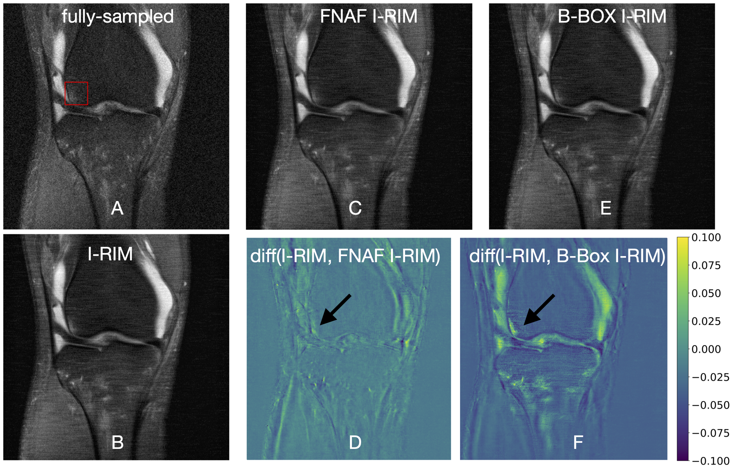 Examples of the effect of robust training using FNAF as well as the real abnormalities on U-Net and I-RIM reconstruction networks are displayed in Fig. 4 and Fig. 5 respectively. In Fig. 4, a coronal section of knee MR (fully-sampled MRI) from the validation set is depicted in (A). This is an MRI from the Fast-MRI dataset which was utilized as image reconstruction ground truth, as well as an input in the validation of the abnormality classification network. In (A), the bounding box highlights the presence of a bone marrow lesion at the lateral edge of the femur, based on the radiologist’s manual annotation. From an accurate analysis, it can be observed that the bounding box includes a portion of the adjacent joint fluid with high signal to test for confounding. In the reported experiment, prior to reconstruction, MRIs were undersampled at a AF. In (B), the reconstruction result by using a baseline U-Net is displayed. This shows that U-Net recreated parts of the BML features in the corresponding region of the femur. Despite that, the lesion was not detected by our lesion classification model, making this a false negative case. In (C), the resulting reconstructed image with the proposed robust training approach appears to have better reconstructed BML features in the corresponding region and, in turn, it is identified by the lesion detection model, correctly making it a true positive case. In (D), a difference map between U-Net and FNAF reconstructions is shown. Radiologist’s opinion propounds that FNAF robust training allowed for a finer reconstruction of particular features, which better mimic the ground truth and is crucial for a precise clinical interpretation. In (E), the reconstruction is obtained post-robust training with real abnormalities (i.e. B-Box U-Net reconstruction); the associated difference map is shown in (F). It is clear that when using real features, the network proved more sensitive to finer anatomical structures. Similar consideration can be done about the reconstruction obtained with I-RIM and robust trained versions, as shown in Fig. 5. The difference map in Fig. 5-(F), between an image reconstructed with I-RIM and B-Box I-RIM further credits the hypothesis that more realistic FNAF would enhance the reconstruction quality as demonstrated by the more prominent difference observed in bone marrow lesion. This would allow radiologists to make accurate diagnoses and avoid missing out on small details, often of utmost importance for image interpretation.