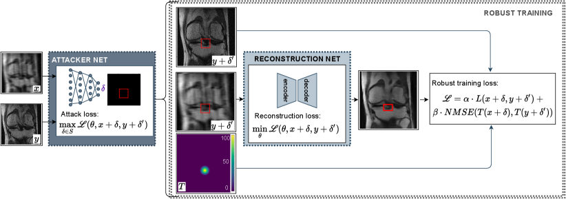 Adversarial attacks aim to maximize the loss of a machine learning model, parameterized by . This can be achieved by changing a perturbation parameter within the set of the allowed perturbation distribution (Madry et al., 2018). Here, was restricted to be a set of visible small features in all locations of an inputted MR image. Formally, this is defined as: