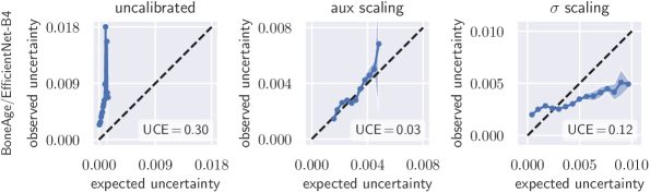 Additionally, we report UCE values from a DenseNet ensemble for comparison. In contrast to what is reported by Lakshminarayanan et al. (2017), the deep ensemble tends to be calibrated worse. Only on BoneAge, the ensemble is better calibrated prior to recalibration of the other methods. After recalibration, both approaches outperform the deep ensemble.