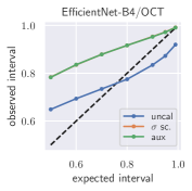 Tab. 1 reports UCE values of all data set/model combinations on the respective test sets. The negative log-likelihood also measures miscalibration; the values on the test set can be found in Tab. 2 in the appendix. In general, recalibration considerably reduces miscalibration. On the data sets BoneAge, EndoVis and OCT, both scaling methods perform similarly well. However, on the BreastPathQ data set, scaling clearly outperforms aux scaling in terms of UCE. BreastPathQ is the smallest data set and thus has the smallest calibration set size. We hypothesize that the more powerful auxiliary model overfits the calibration set (see BreastPathQ/DenseNet-201 in Tab. 1), which leads to an increase of UCE on the test set. An ablation study on BreastPathQ for the auxiliary model can be found in Appendix F.