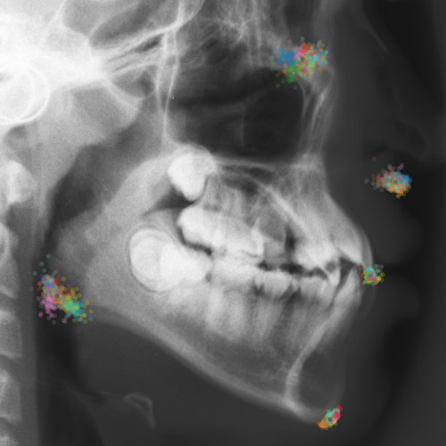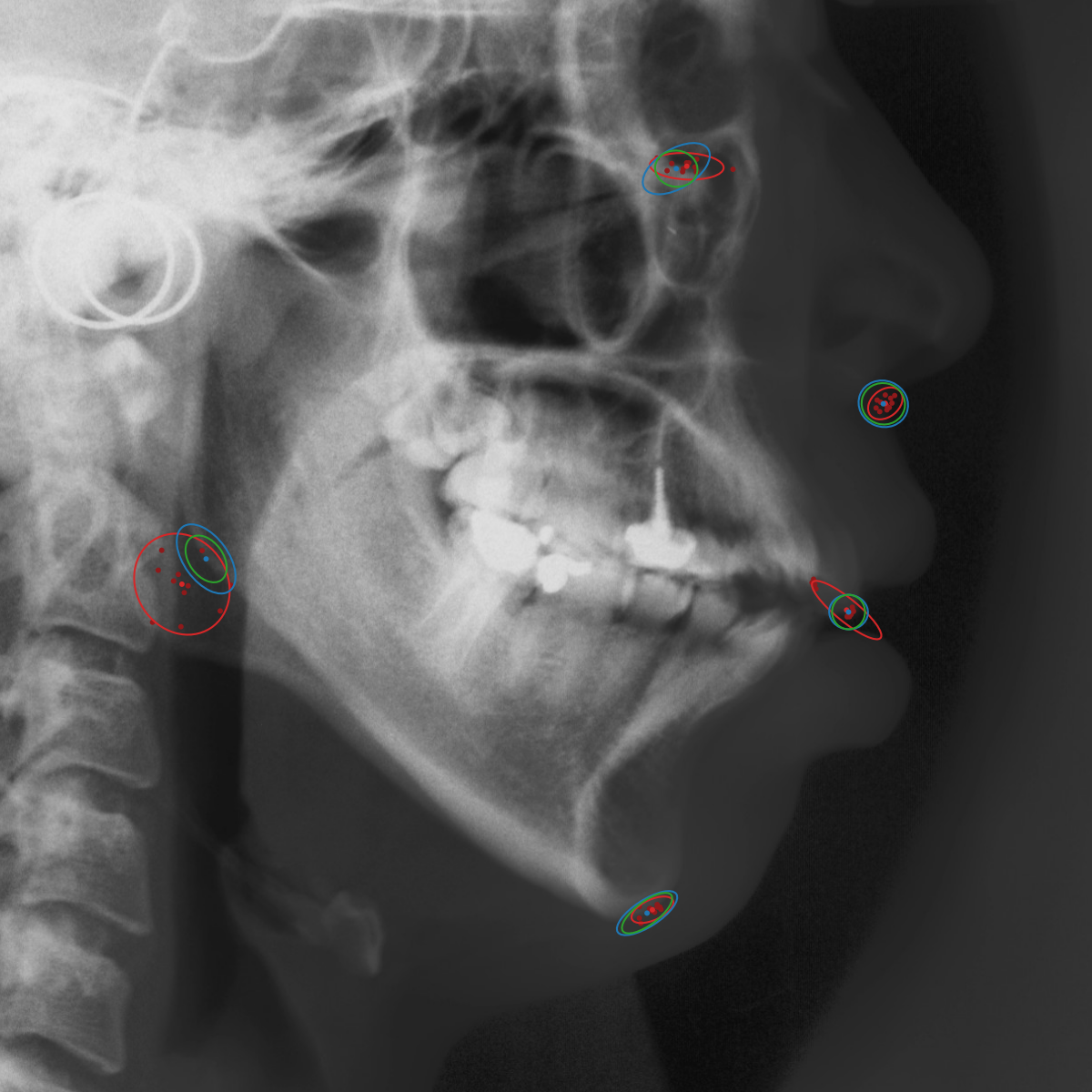 To reliably assess inter-observer variability, neither the hand dataset nor the cephalogram dataset can be used, as they were annotated by only one or two annotators per image, respectively. Therefore, we randomly chose 100 images of the cephalogram dataset and employed nine annotators experienced in medical image analysis to label five characteristic landmarks on each image. Combined with the junior and senior radiologist annotations already existing in the cephalogram dataset, this leads to a total of 11 annotations per image and landmark.
