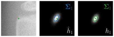 Analyzing Eq. (7) in more detail, not only the predicted heatmaps aim to be close to the target heatmaps but also the target heatmaps aim to be close to the predicted heatmaps . For each landmark , and receive feedback from each other during training (see Fig. 1). While the network parameters are updated to better model the shape of the target heatmap , at the same time, the covariance parameters of each target heatmap (, , and ) are updated to better model the shape of the predicted heatmap . Note that, while is learned from a single annotation per image, the CNN sees one annotation for each image in the training set. This allows implicitly modeling the ambiguities of landmark annotations for the whole training dataset representing a dataset-based annotation uncertainty.