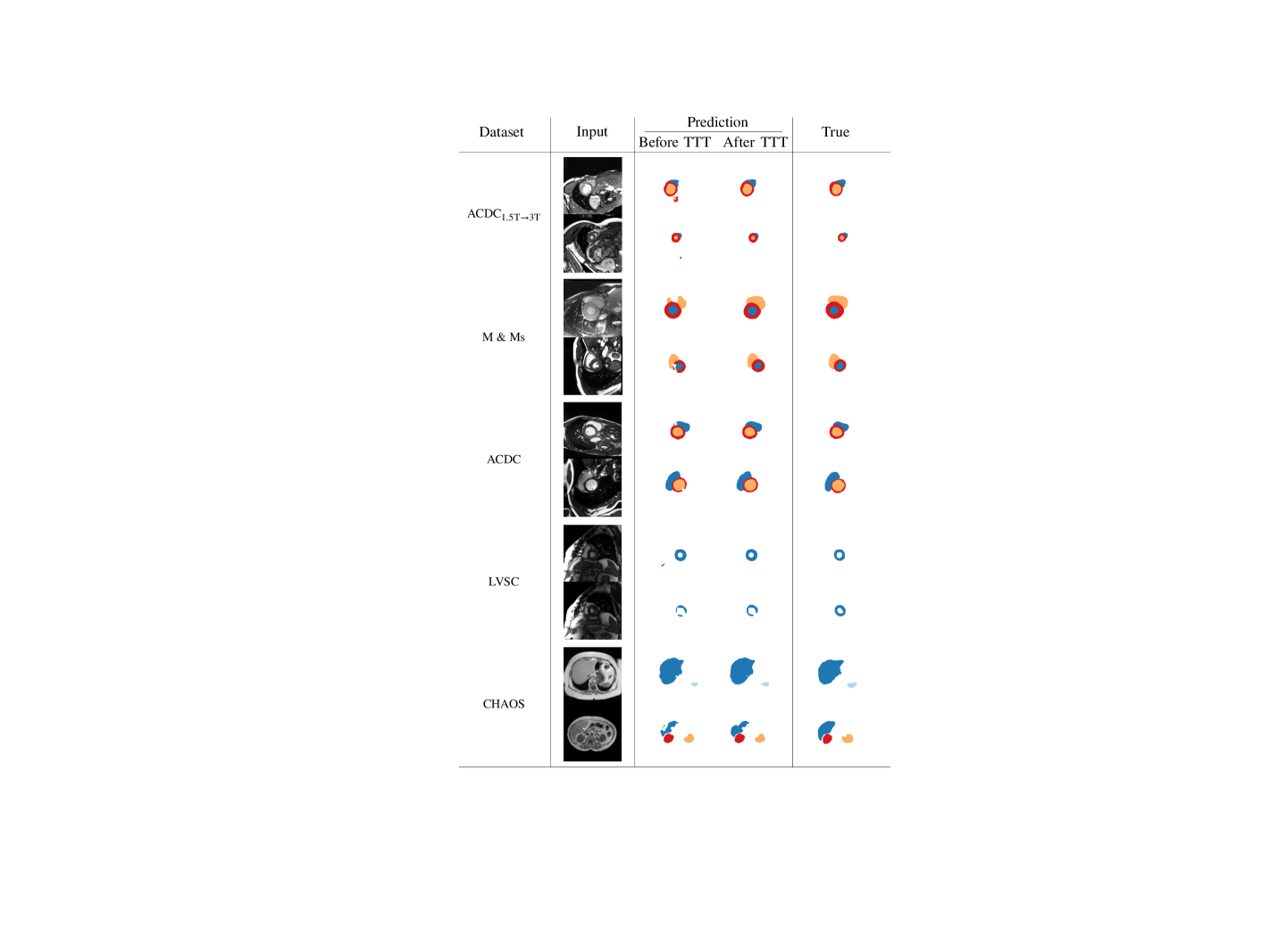 We start with a qualitative example of test-time adaptation in Fig. 3, showing that it helps fix prediction mistakes. As can be seen on all datasets, our method corrects unrealistic masks by removing scattered false positives and segmentation holes.