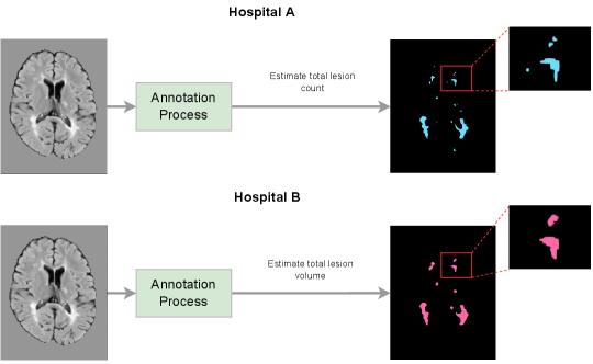 There are many inter-related factors that can have an impact on the annotation style of any given dataset. For instance, many medical image pathology segmentation datasets include semi-manual annotations 111Semi-manual annotation is a process by which trained experts make corrections to the output of an automatic method., where differences in the underlying automated method used, or even the degree of expert correction can have a significant influence on the final annotation. Semi-manual methods are typically used when there is a need to prioritize consistency in the labelling, for example in order to measure changes in lesion load across subsequent scans. Indeed, Hospital B (as depicted in Figure 1(a)) may have opted for a semi-manual approach if there was a need to evaluate the effect of treatment on changes in lesion volume over time. On the other hand, Hospital A may have opted for a fully manual approach in order to best characterize the distribution of lesion counts across the population. While both sets of annotations would be entirely valid for the particular downstream clinical task of interest, they would result in completely different annotation styles. Moreover, several papers have identified annotation biases that result from different annotation styles across raters, even in contexts where labels are derived manually using a consistent annotation protocol (Chotzoglou and Kainz, 2019; Vincent et al., 2021; Jungo et al., 2018; Shwartzman et al., 2019). Even if all the aforementioned factors could be completely controlled for, it is impossible to completely eliminate detection biases (i.e. biases that result from a systematic difference with respect to how outcomes are measured or assessed across identifiable groups).
