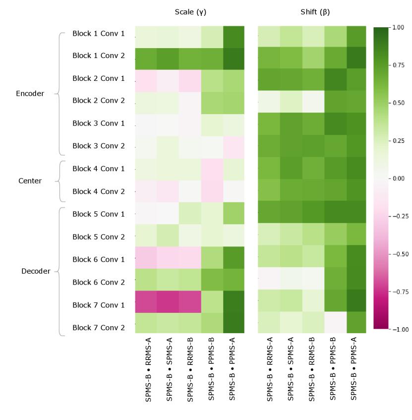Table 3(b) also demonstrates that the grouped-conditioned model is successfully able to learn distinct styles even though several trials share CIN parameter sets. When using different annotation styles (conditioning on the “wrong” group), DICE scores suffer up to 5% performance degradation. This performance degradation further stresses the importance of understanding sources of annotation styles and their relationships. If researchers make assumptions about the sources of annotation styles, for example if they assume a disease-subtype cohort bias is the main cause of the annotation style, they can make incorrect groupings and combine datasets with incompatible annotation styles. For example, in this case, SPMS-B and PPMS-A are not the same disease subtype, but they have compatible annotation styles. Contrarily, PPMS-B is the same subtype as PPMS-A, but as shown in Table 3(b), they have somewhat incompatible annotation styles resulting in the aforementioned performance degradation.