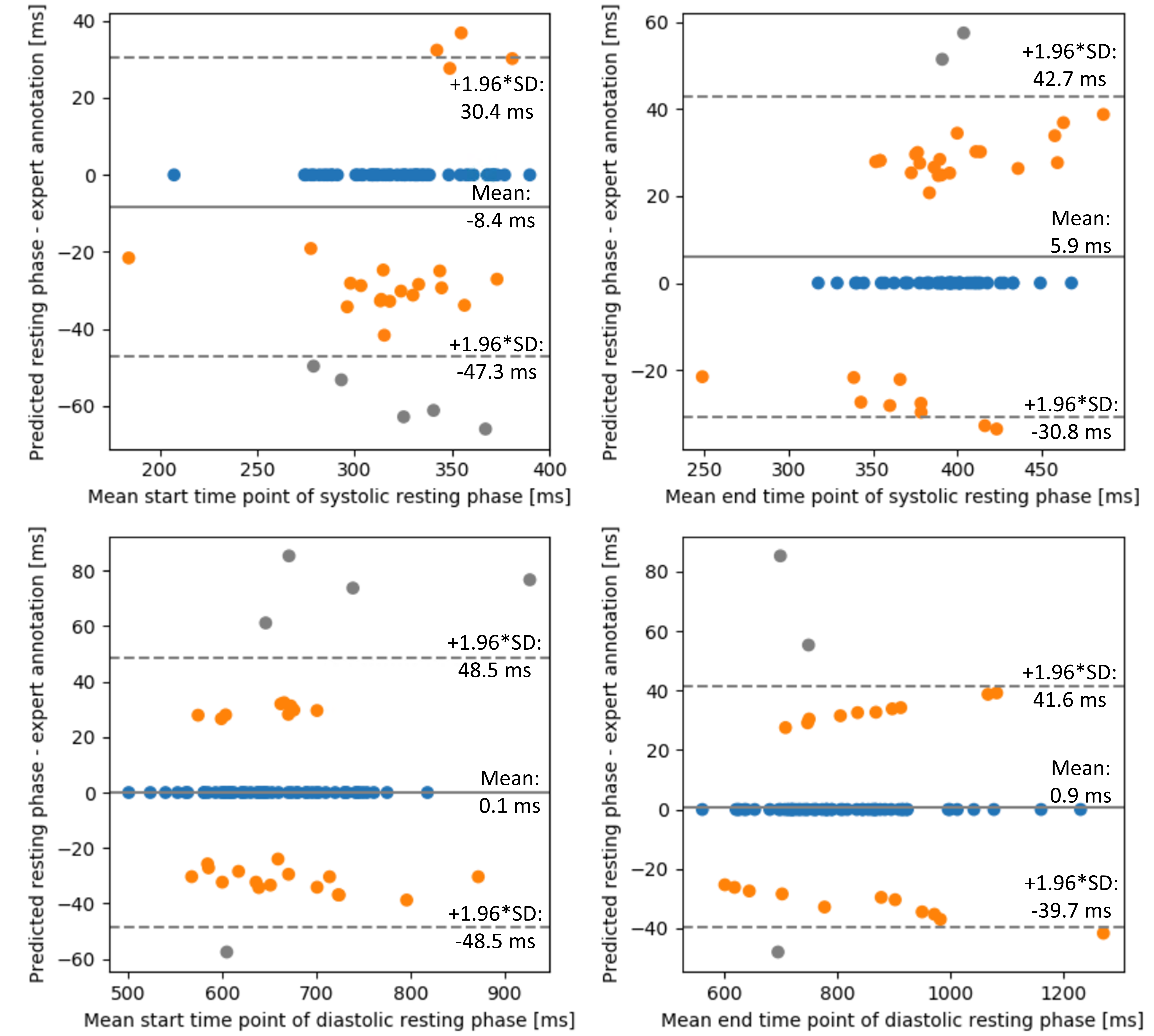 The datasets with RPs with less than 30 ms were discarded (n=9). Further, there was no systolic RP annotated by the expert in 14 cases, and no diastolic RP in 12 cases. These phases were excluded from the analysis. The matched with the annotation, or was off one frame in 93.6%, the in 97.5%, the in 93.8% and in 96.3%, respectively. was detected earlier/later than the expert’s annotation in 27.8%/5% and in 20.9%/16.0%. was detected earlier/later than the expert’s annotation in 11.4%/29.1% and in 15.2%/14.8%. In average, the was selected earlier than the ground truth in 24.3% of the cases and later in 10.6%. In 10 cases, outliers were present, off by 2 or more frames. In 10 cases, there were outliers present for the , off by 2 or more frames. For the , it was off by 2 or more frames in 5 cases.