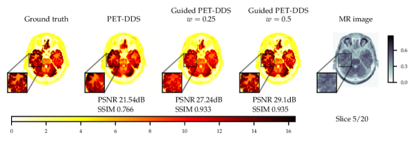 This is equivalent to the classical Euler-Maruyama scheme, when is chosen in such a way that it incorporates the step size and the diffusion function . We follow Chung et al. (2023a) and define . For PET-DDS a constant penalty , without time dependency, is used. Heuristically, the number of iterations used for data-consistency projection were adjusted such that the results, with , overfit to noise. The penalty strength was then increased to regularise the reconstruction more. In 2D the number of projection steps for PET-DDS were set to for noise level and for noise level . In 3D the number of projection steps for PET-DDS were set to for both tracers. For guided reconstruction, steps for noise level and steps for noise level were used for PET-DDS.