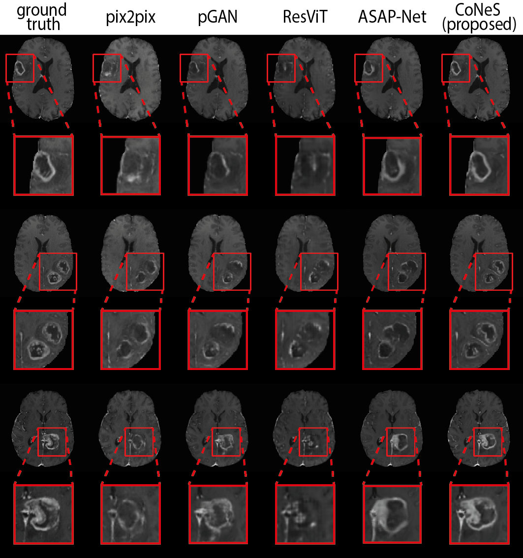 Ablation studies were performed to verify the benefits of individual components in the proposed method. For simplicity, we trained a baseline CoNeS model that translates T1ce from T2 on BraTS 2018. We first examined the added value of the source image as input to the MLP by removing the intensity value from the input channel. In this case, the neural fields are conditioned on the latent code only. Next, we compared shift modulation against a full hypernetwork where all the parameters of the MLP are generated. Last, we trained the proposed method without the adversarial loss to show the contribution of the discriminator in our model. Wilcoxon signed-rank tests were performed between the baseline model and ablated models. Quantitative and qualitative results are shown in Table 7 and Fig. 6. We noticed that although the model without adversarial loss achieves marginally better SSIM and PSNR, the results, especially the tumor region, are visually blurry, which shows that the adversarial loss helps the model to reconstruct more details and outputs more realistic images. Apart from this, the proposed model obtained the best results among the ablated models that include the adversarial loss and showed significant differences () in SSIM. These results also show that shift modulation helps to reduce the parameters from 14.5k to 0.26k, which is the number of neurons in the MLP, without loss of representation capability. Moreover, although the instance-specific information is already encoded in the latent code, conditioning the network on intensity directly can still add extra information and improve performance.