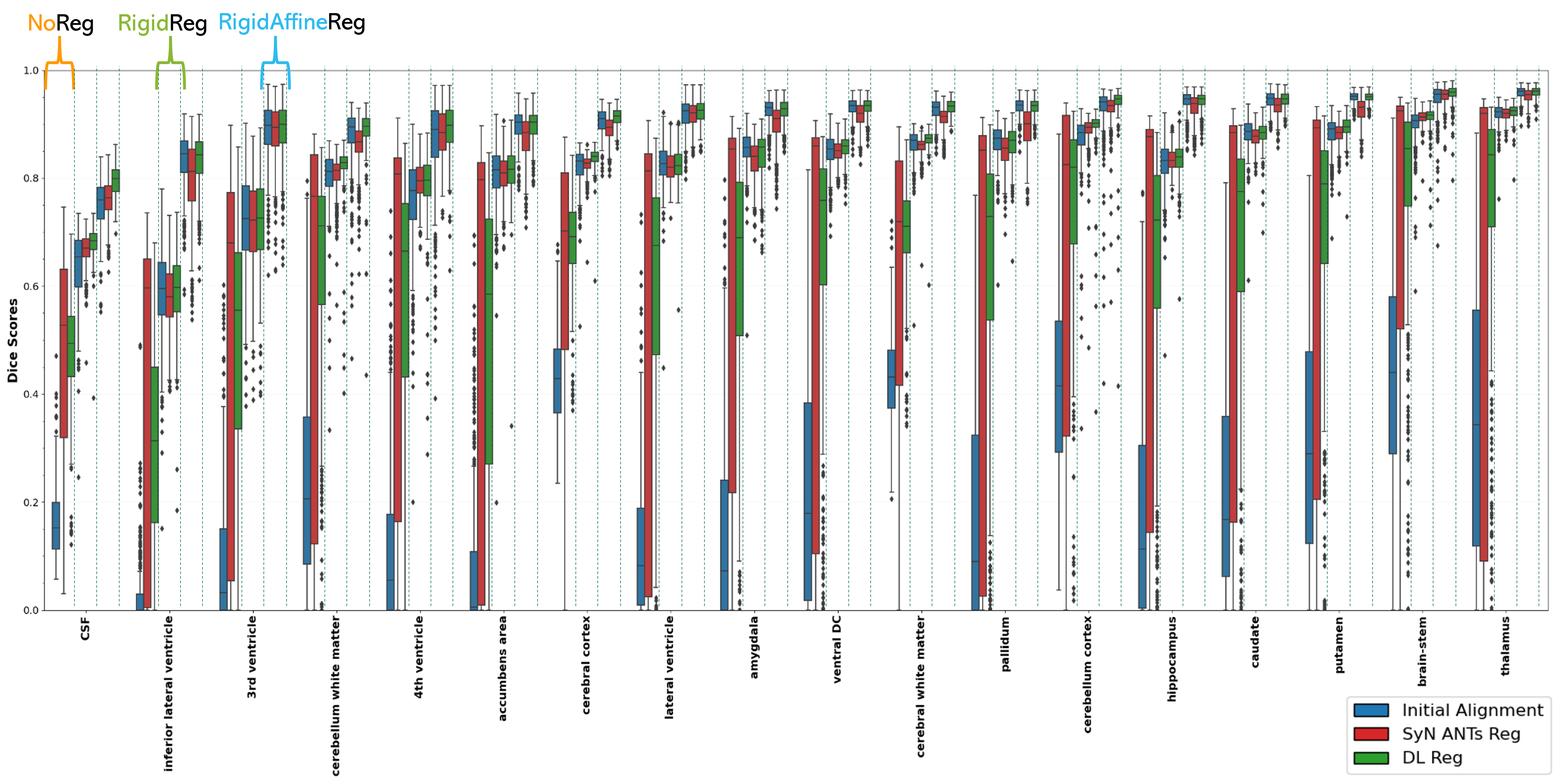 Furthermore, due to the non-parametric nature of the data, two-sided Wilcoxon tests have been conducted for all three initialization approaches between DL Reg and SyN ANTs. For NoReg, the median results from DL-based approaches are not statistically different from those of SyN ANTs across all three segmented regions (p-values 0.18, p 0.05). In contrast, for RigidReg and RigidAffineReg, the results from DL-based approaches show a statistically significant difference from those of the corresponding ANTs pipelines in all three regions (p-values 1.27e-17, p 0.05). As shown in Table 2, for both RR and RAR initializations, DL Reg outperforms SyN ANTs for all three segmented regions. However, SyN ANTs has decreased performances compared to the initial alignment. As for NR, only the average Dice score calculated on CSF tissues for DL Reg are equal in comparison to SyN ANTs however with a smaller standard deviation. When examining each of the 18 segmented regions individually, p-values and statistical significance (p0.05) were determined from Wilcoxon tests, which compare SyN ANTs Dice scores to initial Dice scores before any initialization (Figure 13), DL Reg Dice scores to initial Dice scores before any initialization (Figure 14) and DL Reg Dice scores to SyN ANTs Dice scores (Figure 15), all of which are presented in the supplementary material. Learning-based results show a statistically significant difference across all 18 regions when compared to the initial alignment for NR. However, there are some exceptions for the two other initialization approaches: for RR initializations in regions such as the caudate, 3rd ventricle, and amygdala, and for RAR initializations in the putamen, pallidum, 3rd ventricle, hippocampus, amygdala, and accumbens area. Also, the percentages of instances where SyN ANTs outperforms DL Reg for NR (64.1%), RR (28.6%), and RAR (10.8%) initializations were calculated across all 18 regions, considering a total of 431 pairs.